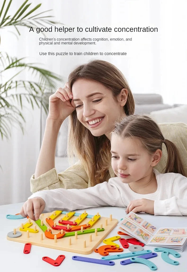 The Wooden Geometric Pegboard Set is a Montessori-inspired educational toy designed to spark creativity and support early childhood development. With 33 colorful blocks in 12 different shapes, children can build letters, flowers, cars, houses, and more—guided by a graphic booklet containing 96 puzzle patterns. Crafted from smooth, durable wood and high-quality plastic, this pegboard set is safe for little hands and perfect for both home and classroom learning. By combining play with problem-solving, kids strengthen fine motor skills, logical thinking, and imagination while having endless fun.