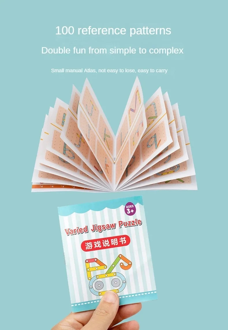 - Set Includes: 33 blocks in 12 shapes, wooden pegboard, and booklet with 96 creative patterns